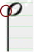 数字の「9」あるいはアルファベットの小文字「q」「g」のように、2分音符を書くこともできます。書き始める位置を左右反対にして、直線は傾けずに、下へ真っ直ぐ引きます。符頭と棒(=符幹)を分けるのではなく、符頭の左下から書き始め、1周させ、そのまま真下に降ろすようにします。