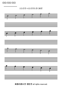 五線の第3間から上第一間まで上に上っていく2分音符、そして4分音符と、下へ下がっていく2分音符と4分音符の書き方に慣れてください。